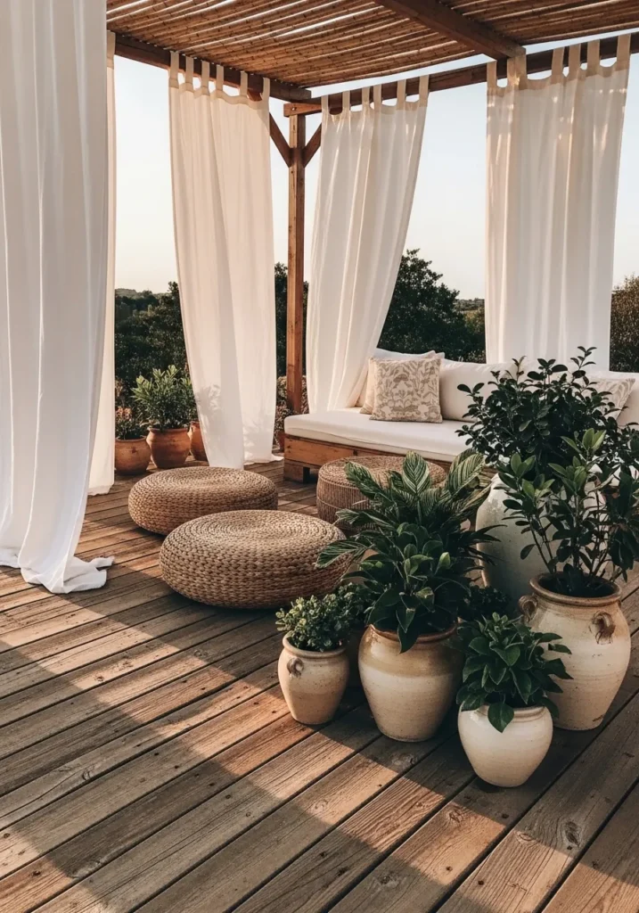 A wooden pergola frames a serene terrace corner, complete with sheer white curtains and a low cushioned seat. Woven poufs and clustered ceramic pots add texture against the warm wooden deck. Soft greenery balances the neutral palette beautifully.