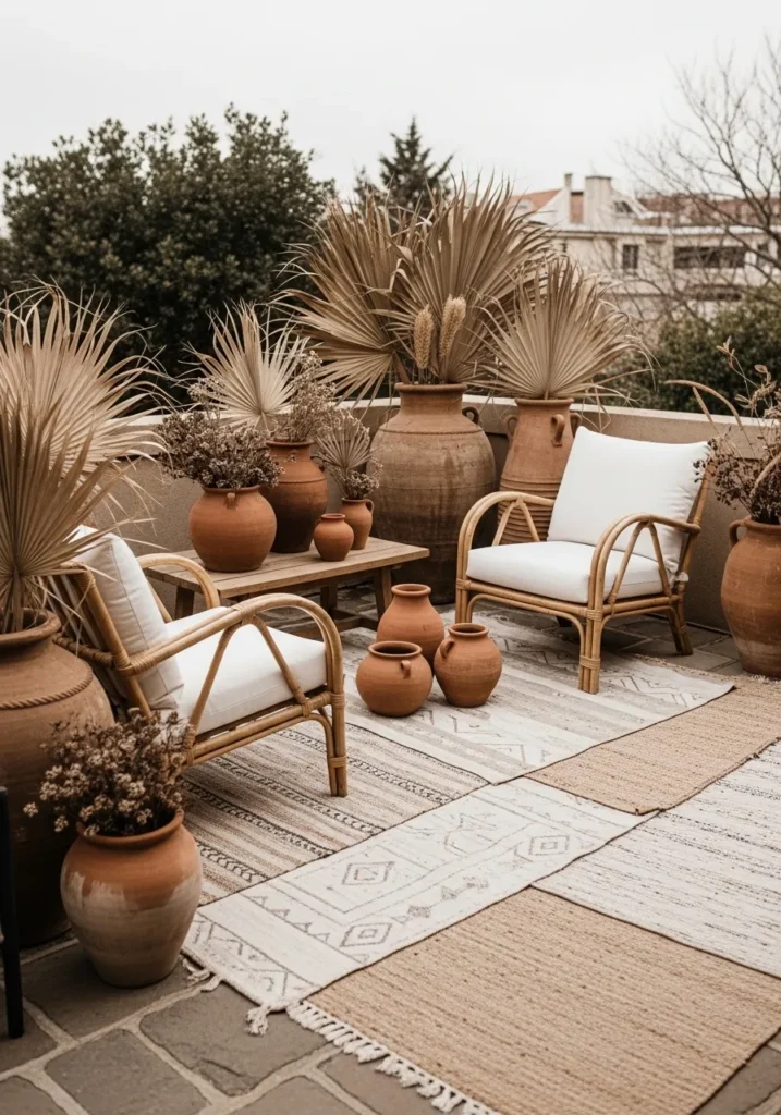 This terrace embraces warm beige tones with white woven chairs, clay pots filled with dried pampas grass, and layered jute rugs. The arrangement feels balanced and airy, with natural textures doing all the talking.