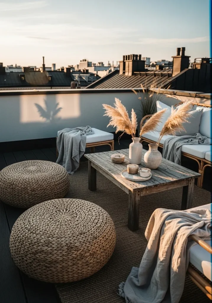 Soft Neutral Balcony with Woven Poufs