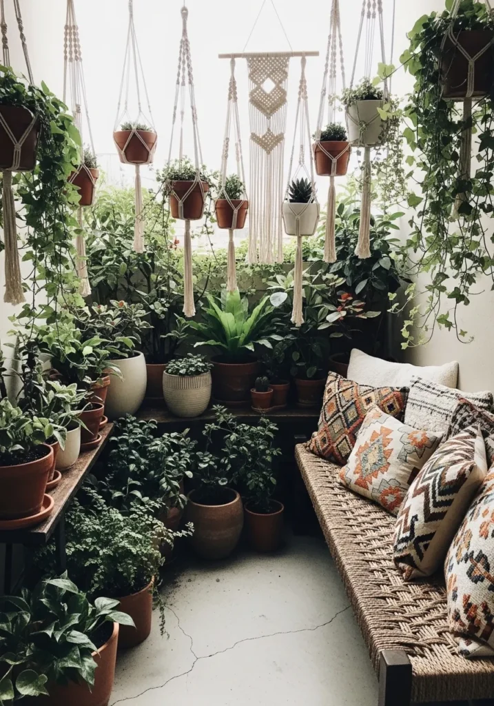 This terrace bursts with greenery, featuring hanging macramé planters, layered rugs, and colorful patterned cushions. A mix of woven stools and small wooden tables adds dimension, while climbing plants create a soft natural backdrop.