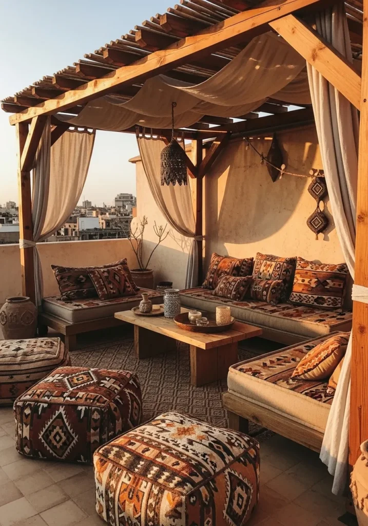This terrace features a wooden pergola with flowing curtains framing a low seating area filled with patterned cushions. Earthy tones dominate the palette, and woven poufs complete the relaxed layout. The structure creates a sense of enclosure while still feeling open and airy.