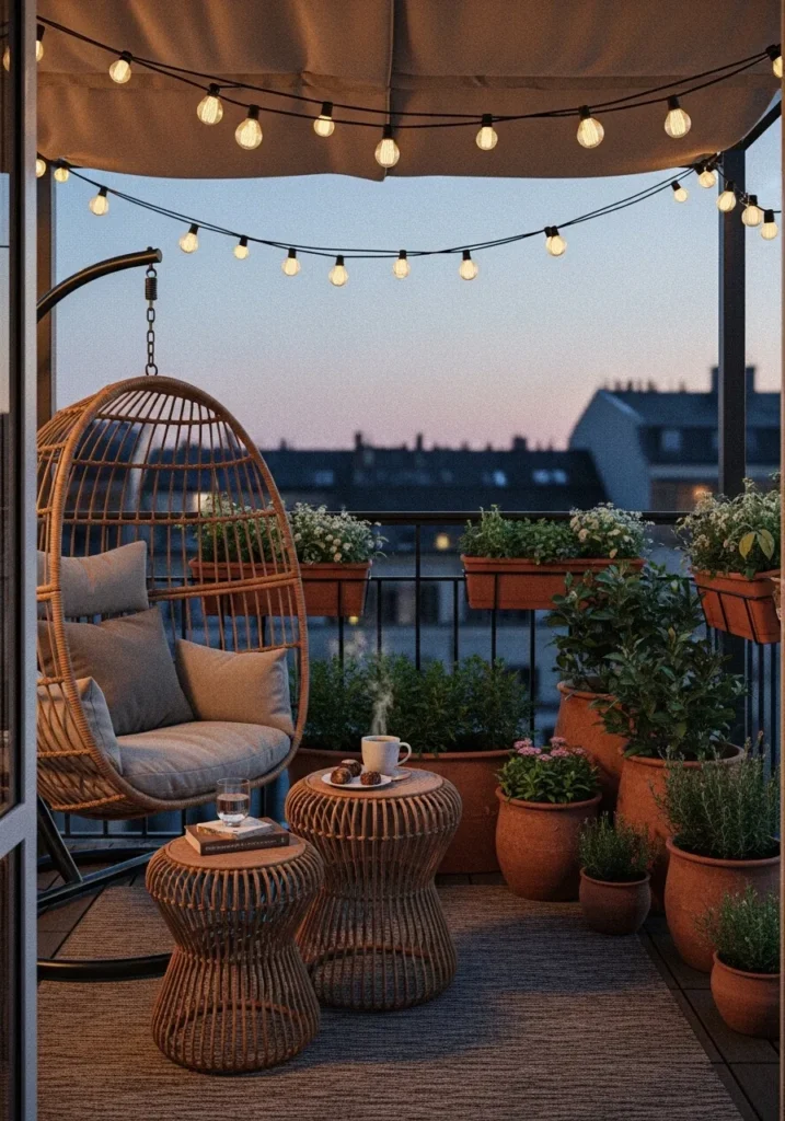 Warm string lights glow above a rattan chair and small woven tables. Terracotta pots filled with plants surround the seating area, adding life and texture. The evening sky creates a soft backdrop that enhances the cozy atmosphere.