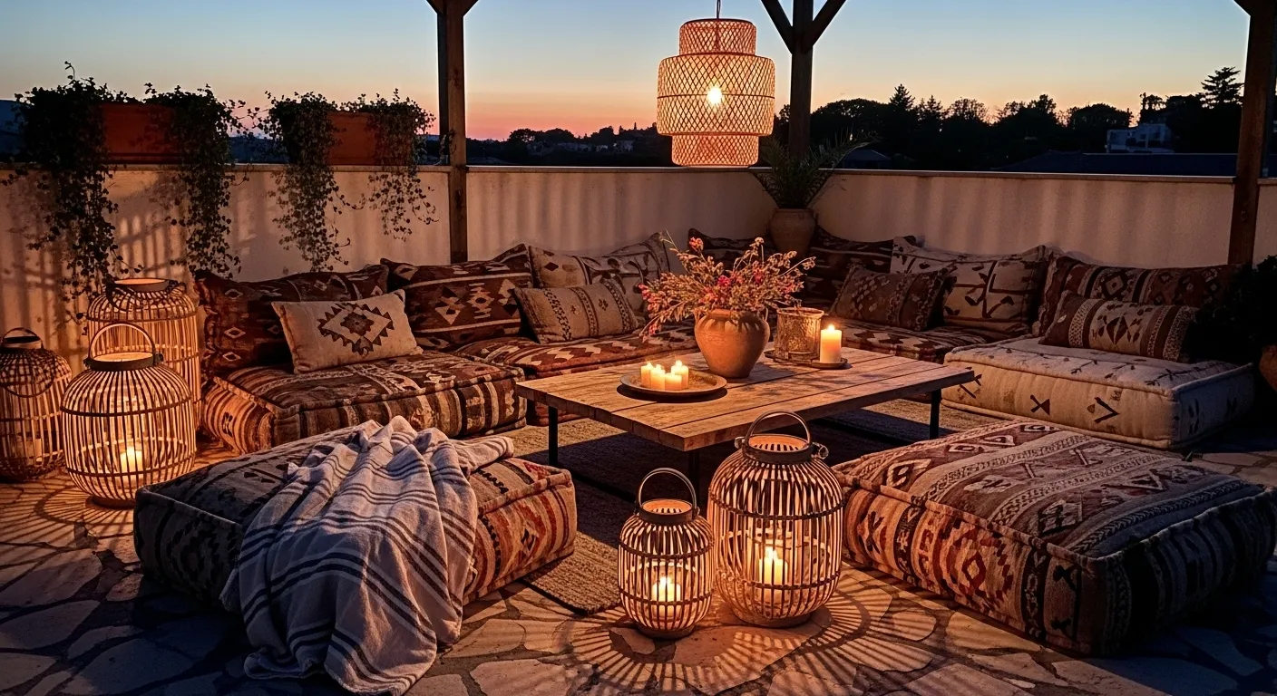 Layered patterned rugs cover the terrace floor, while lanterns and a round metal table create a cozy focal point. The skyline glows in the background as the sun sets, casting warm golden light across the cushions. Rich earthy reds and deep neutrals complete the boho aesthetic.
