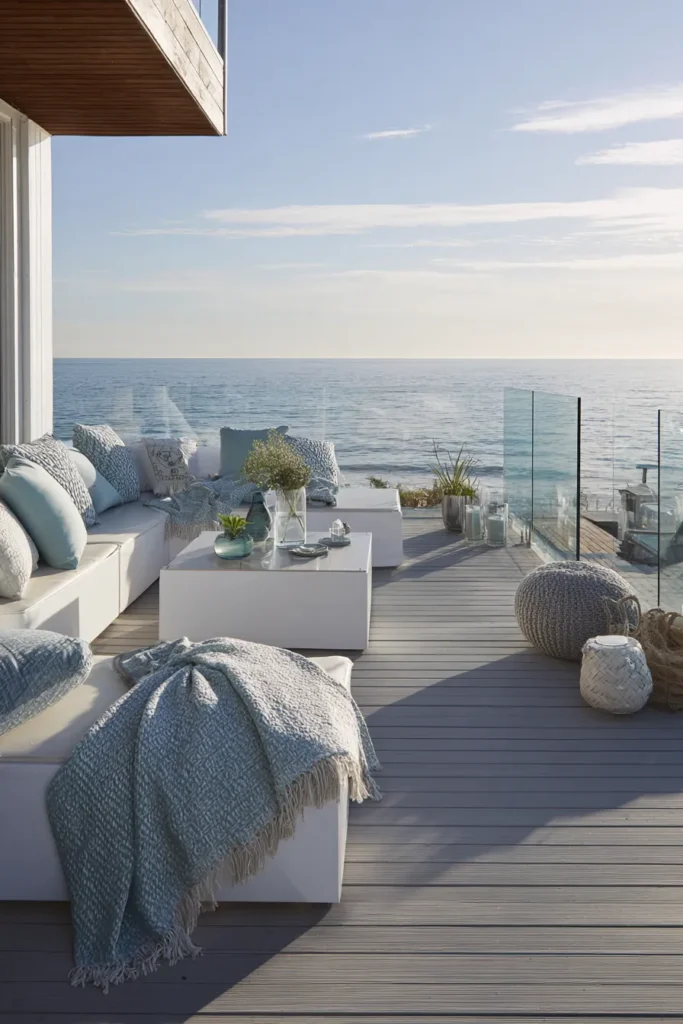 This deck feels light and open with its pale wood flooring, glass railing, and low profile seating that hugs the view. Soft cushions in sandy tones and gentle blues create a relaxed lounge setup without blocking the ocean beyond. Everything feels intentional yet unfussy, allowing the sea and sky to remain the main focus.