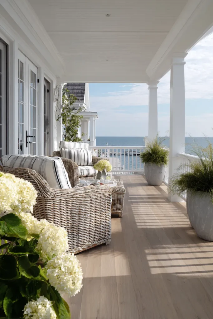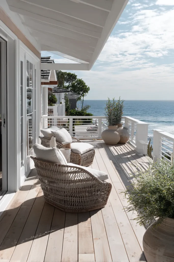 Wicker chairs and rounded shapes give this deck a relaxed and approachable feel. Pale wood flooring and white siding keep the palette light, while layered cushions add comfort. The ocean view peeks through effortlessly, grounding the space in its coastal setting.