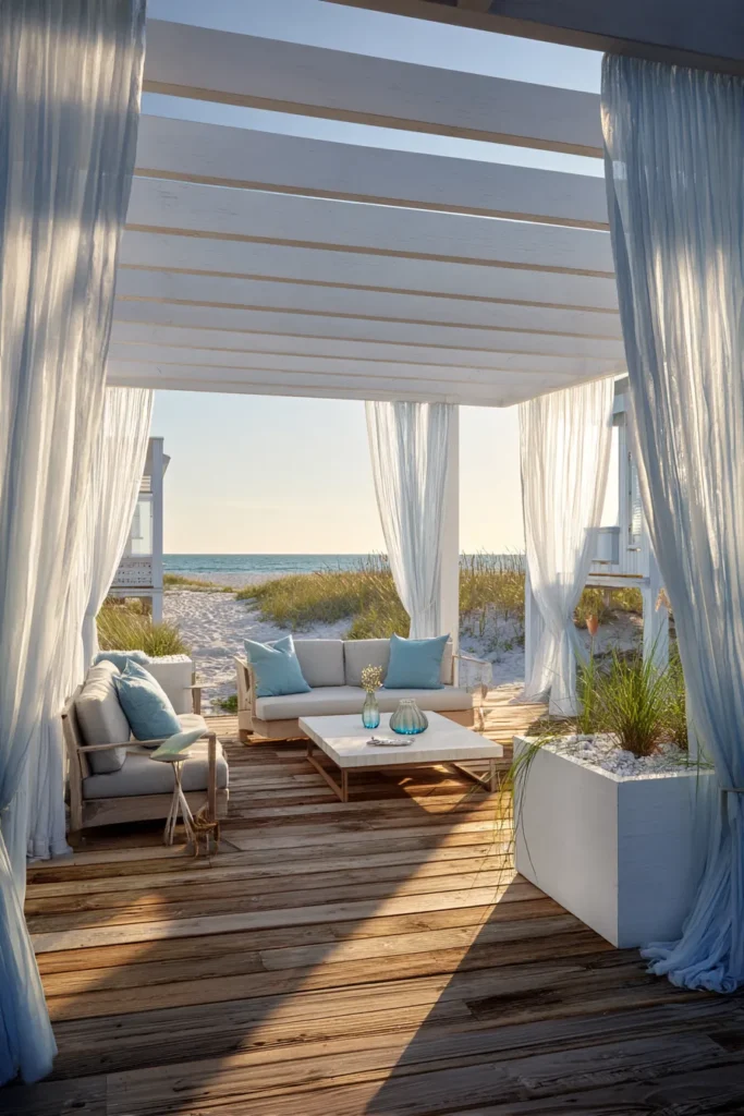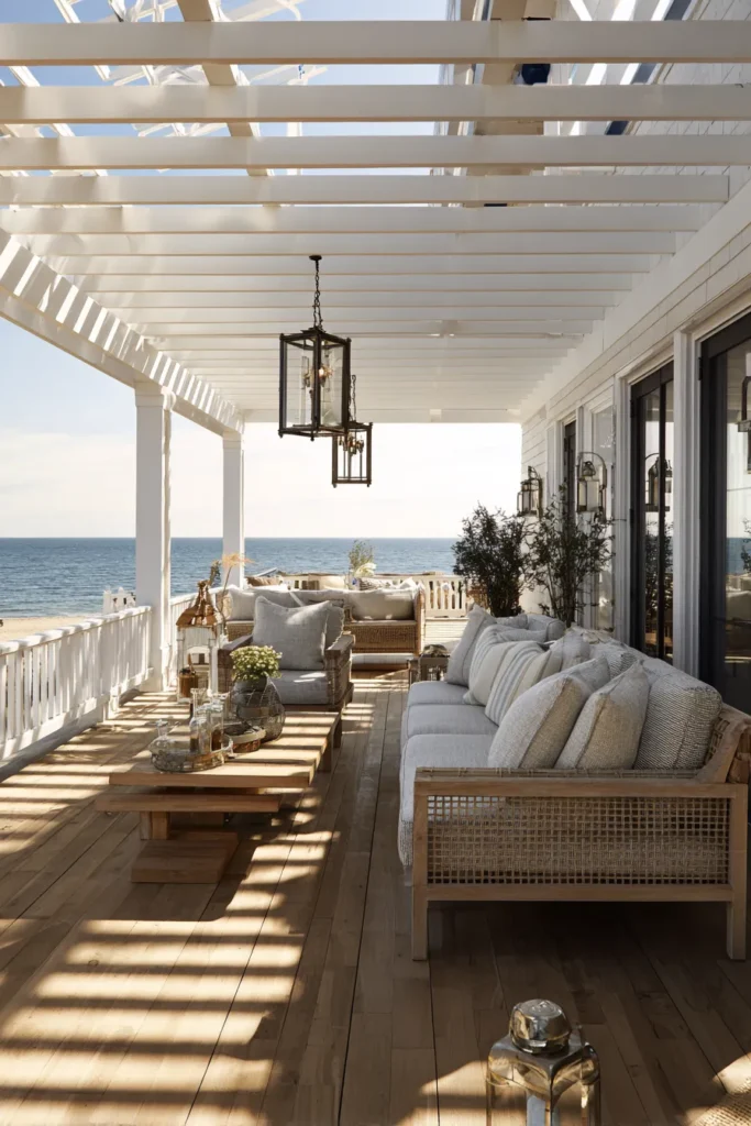 A white pergola stretches overhead, casting soft shadows across warm wood floors. Deep seating with plush cushions creates a relaxed lounge zone that faces the ocean. Lantern lighting and subtle coastal decor add just enough character without overwhelming the space.