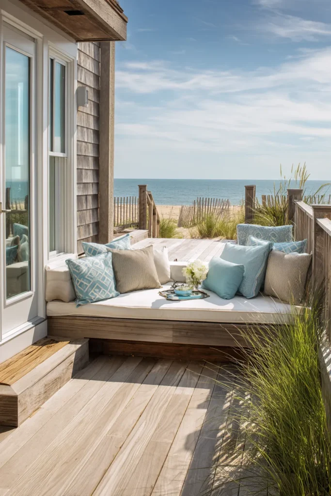 This deck uses built in bench seating to create a snug and inviting layout. Light wood floors pair beautifully with soft blue and neutral cushions. Tall grasses along the edge add privacy while keeping the look natural and beachy.