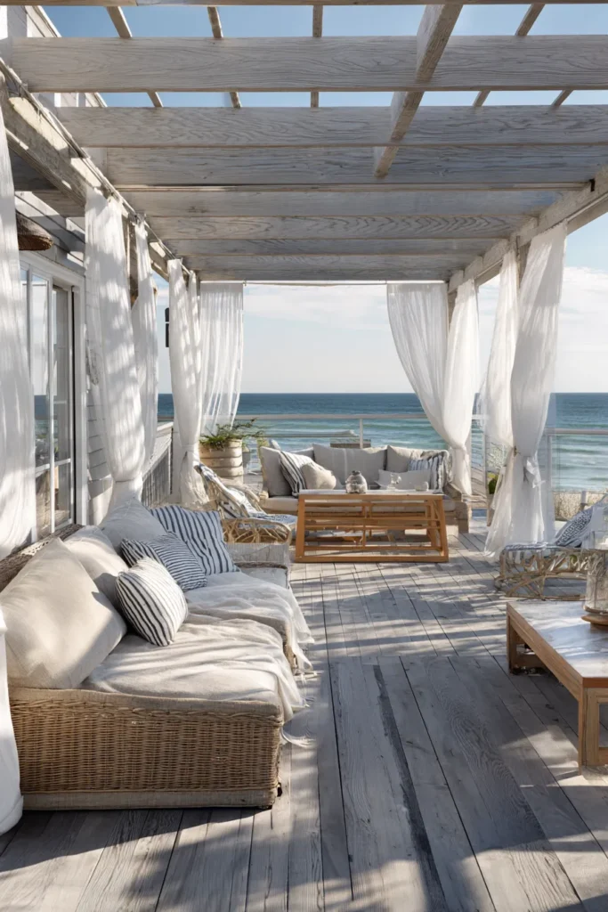 This deck features weathered wood planks, a white pergola overhead, and flowing sheer curtains that soften the structure beautifully. Woven seating and layered cushions create a cozy lounge feel while still staying breezy and coastal. The ocean view peeks through effortlessly, framed by light and texture.
