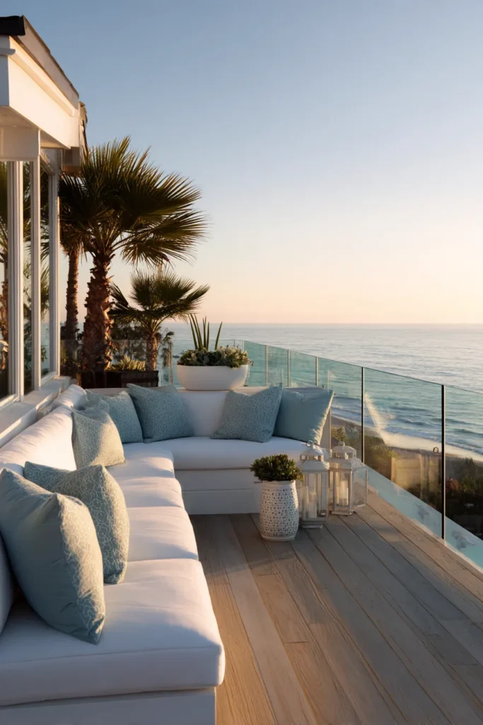 Designed to soak in golden hour, this deck uses glass railings and light wood flooring to keep the ocean view wide open. Plush seating in neutral tones lines the edge, creating a front row seat to the sea. Subtle greenery and clean lines keep the look modern yet warm.