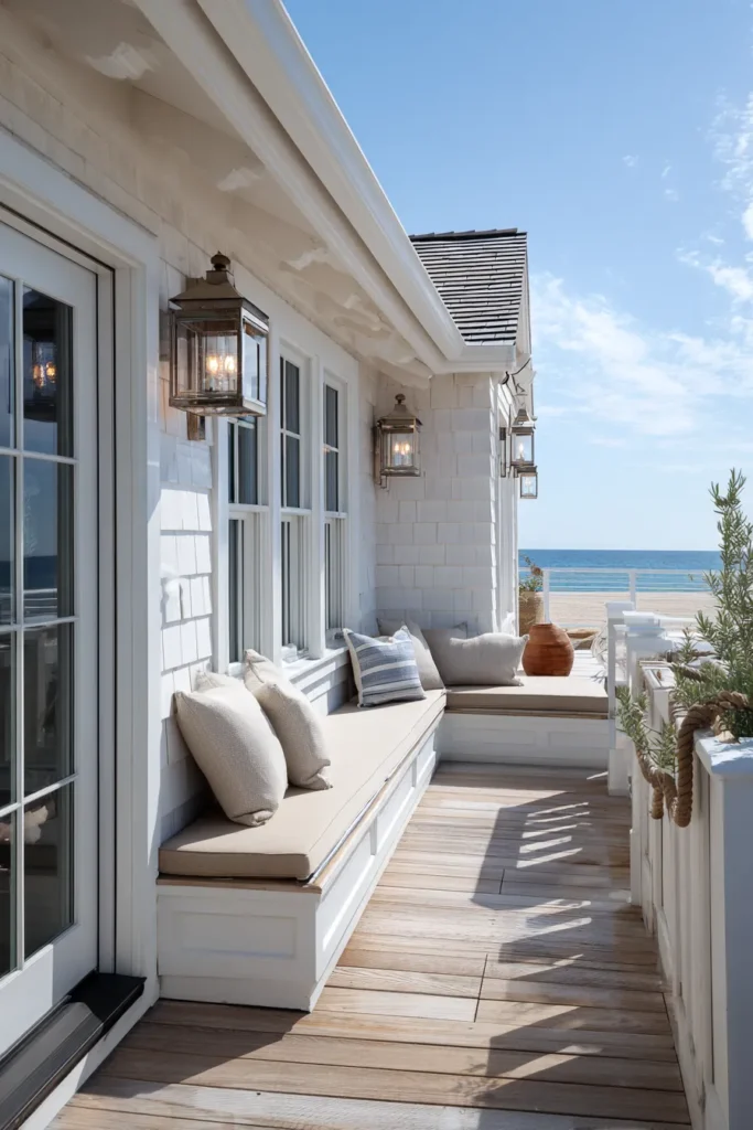 This long and narrow deck makes the most of its layout with built in seating and soft cushions along the wall. White siding and pale wood floors keep everything light, while lantern style wall lighting adds warmth. The ocean view runs parallel to the space, making it feel endless.