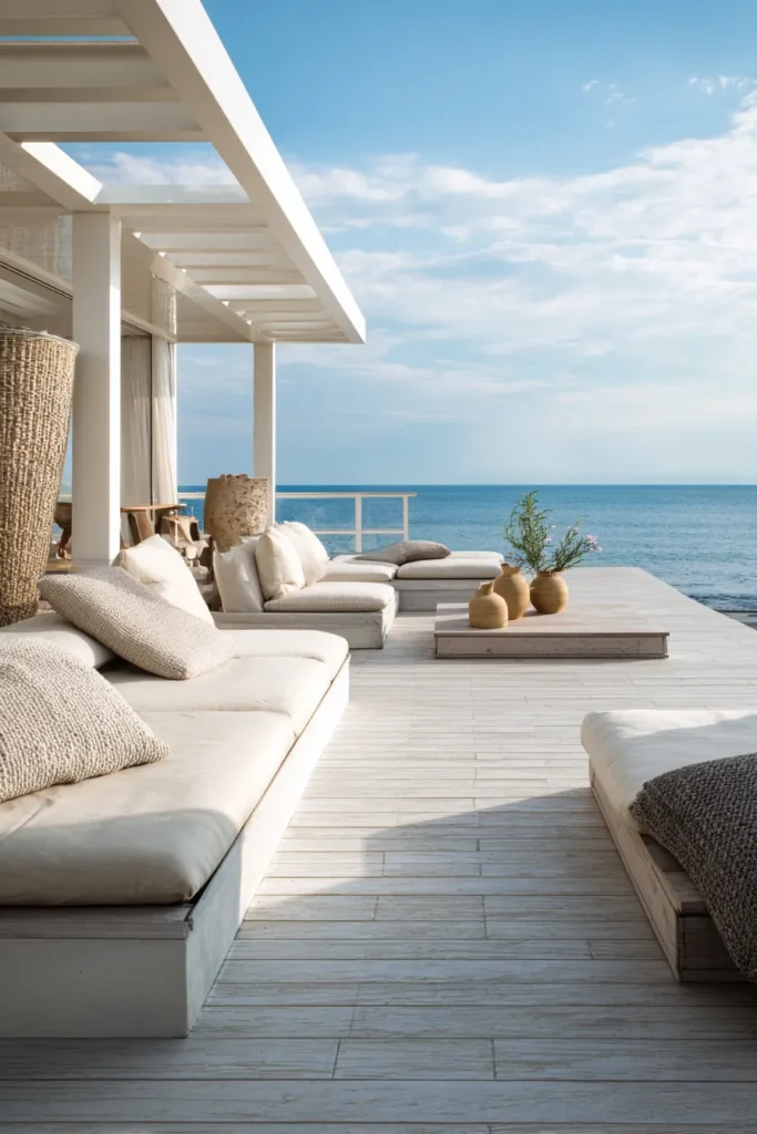 This coastal deck feels open and effortless with its pale wood flooring, soft white seating, and uninterrupted ocean views. The low profile furniture keeps the focus on the horizon, while textured pillows and natural accents bring in that relaxed beach house softness. Everything is arranged to feel calm and uncluttered, letting the light and sea do most of the talking.