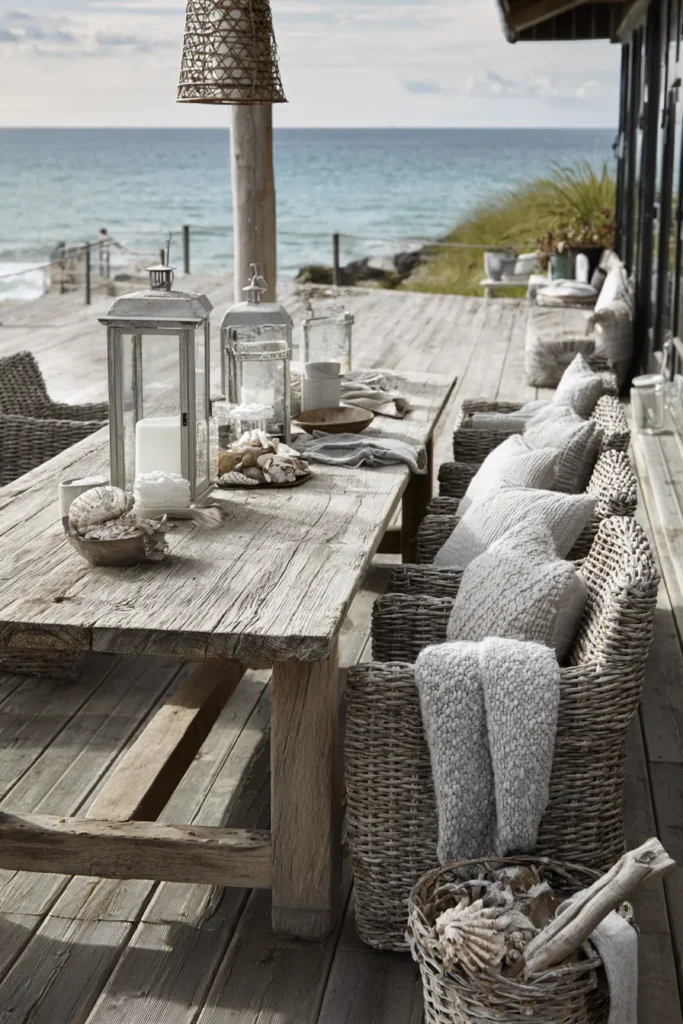 Weathered wood floors and a long dining table give this deck a relaxed coastal farmhouse feel. Textured seating, lanterns, and natural materials add warmth while the ocean view keeps everything light and breezy. The space feels social but still calm.