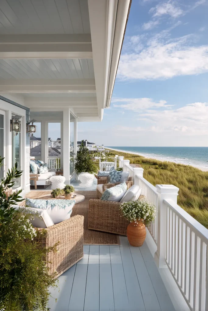 This elevated deck wraps around the home with white railings, soft blue flooring, and layered seating areas. Wicker furniture and neutral cushions bring in texture, while the height gives sweeping views of dunes and sea beyond.
