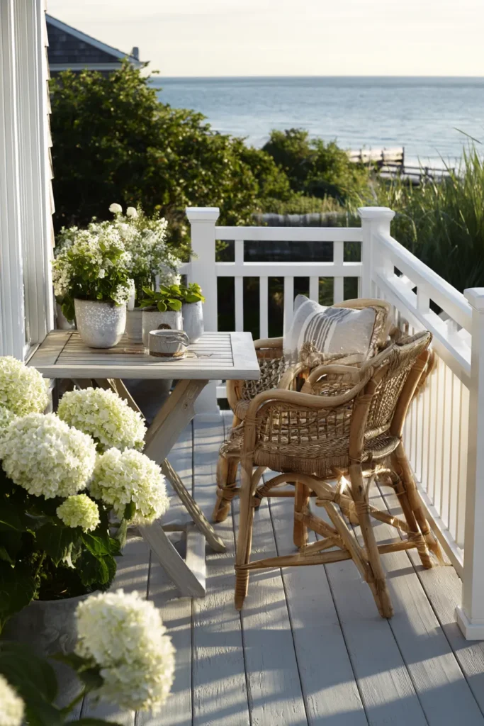 A small bistro table, woven chairs, and blooming hydrangeas give this deck a charming and intimate feel. The painted wood floor and white railing create a classic coastal backdrop that feels bright and cheerful. The ocean view adds just the right amount of drama.