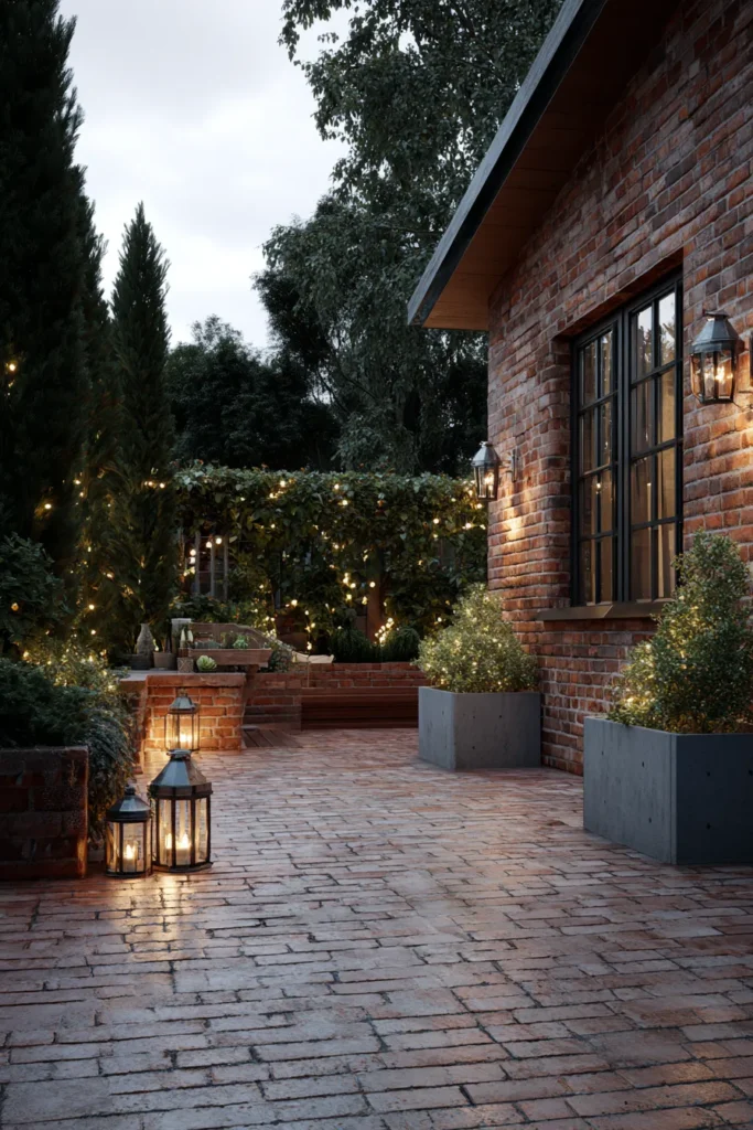 This patio is pure evening magic with its rich red brick flooring, black window frames, and warm string lights wrapping the greenery. The lanterns on the ground cast a soft golden glow that bounces off the textured brick, creating a cozy, timeless atmosphere that feels effortlessly elegant.