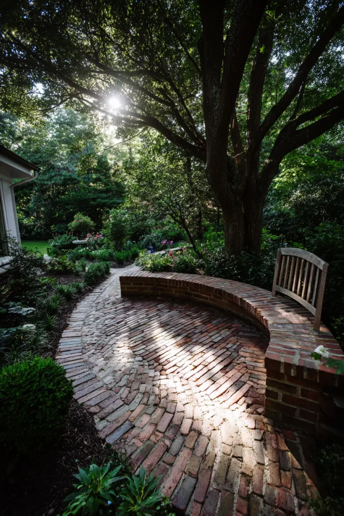 What I love about this design is how effortlessly it connects with nature. The aged brick adds warmth and history, while the towering trees give it a sense of protection and calm. It’s the kind of patio that feels timeless, like it’s always been part of the landscape.