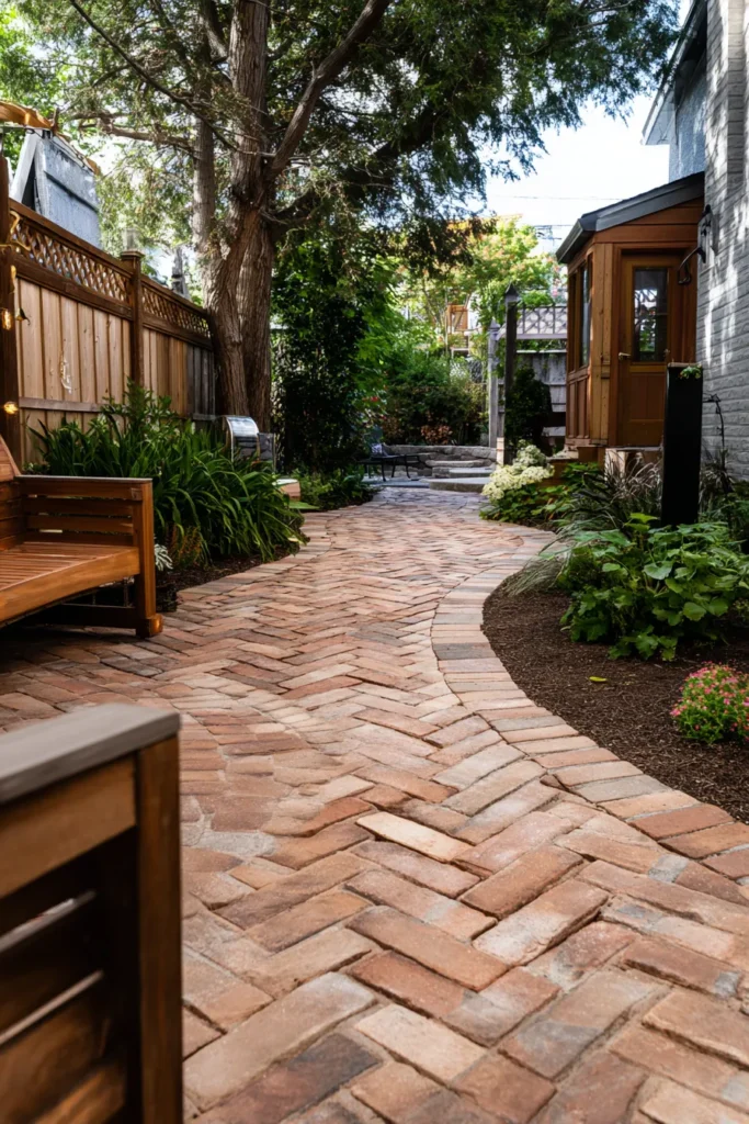 This charming walkway features a warm-toned herringbone brick path weaving through a cozy backyard. Wooden seating, green foliage, and soft natural lighting create a peaceful, welcoming vibe that feels instantly homey.