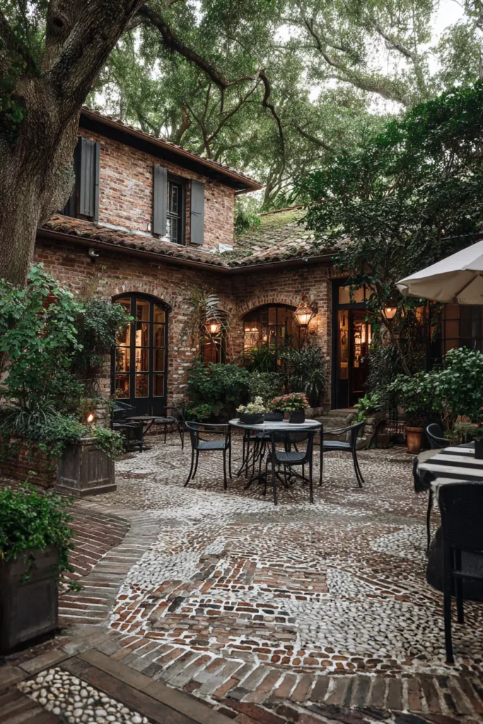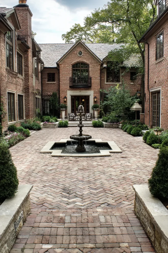 This grand courtyard feels like stepping into a European villa, complete with a central fountain surrounded by warm-toned herringbone brick. Tall brick walls and arched windows create a sense of privacy, while the greenery adds softness and color.