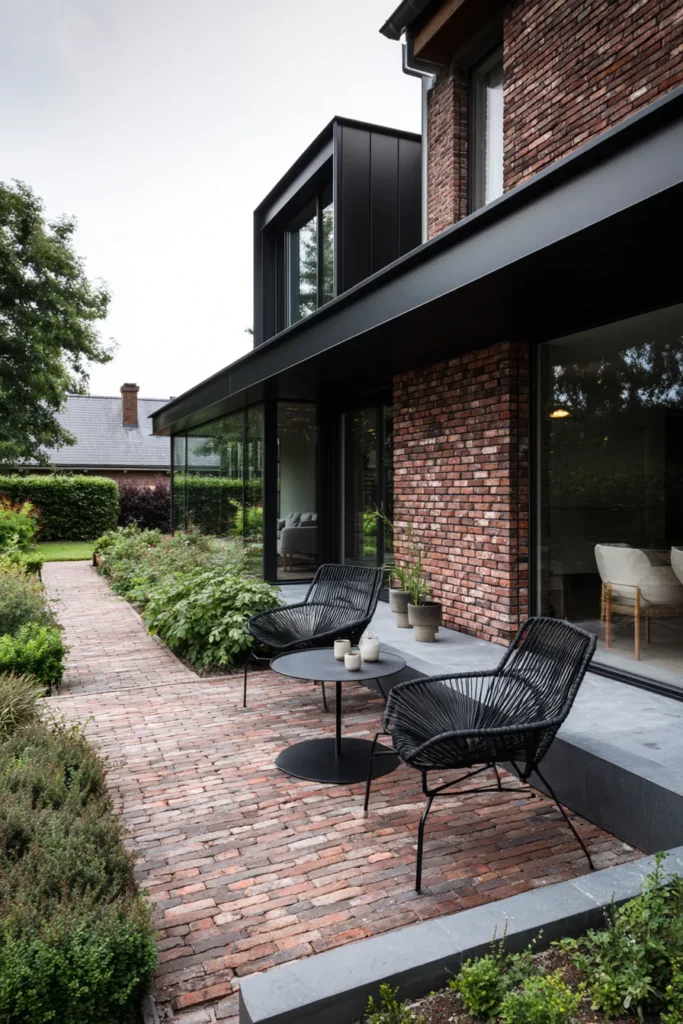 This modern brick patio features sleek black metal accents, a slim overhang, and a clean-lined layout. The subtle contrast between the deep red brick and matte black details creates a stylish and minimal aesthetic.
