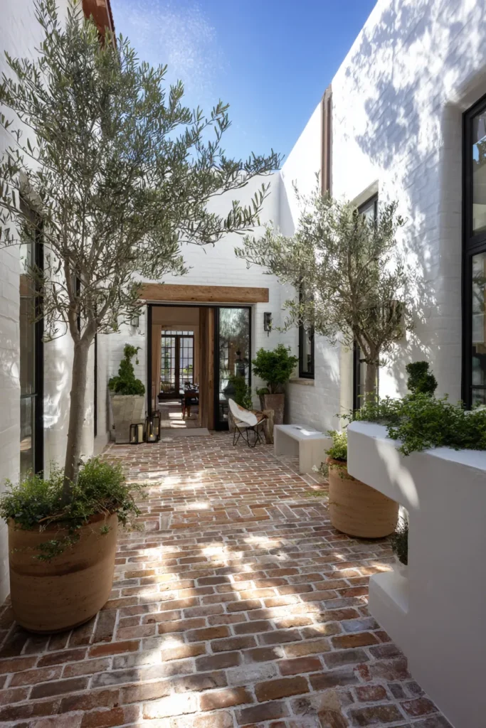 This bright courtyard feels fresh and airy, with pale brick flooring framed by whitewashed walls and potted olive trees. The sunlight bouncing off the light surfaces gives it a soft, serene glow.