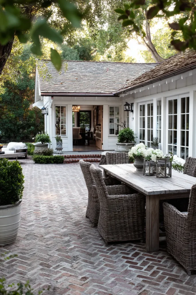 This inviting brick patio pairs herringbone brickwork with white exterior walls and rustic wicker furniture. The long wooden dining table, lanterns, and boxwood planters make it the perfect outdoor gathering space.