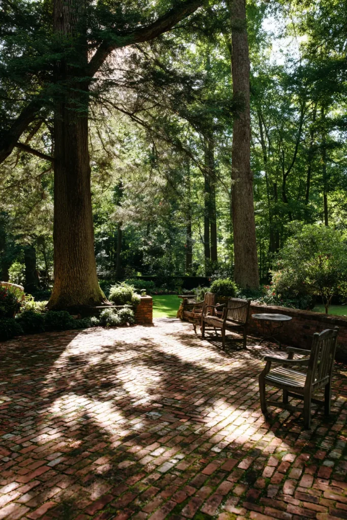 This peaceful patio feels like a hidden woodland retreat. The rustic brick flooring blends beautifully with the towering trees overhead, while dappled sunlight filters through the leaves, casting soft shadows across the ground. A few wooden benches and a small table complete the space, making it an ideal spot for morning coffee or quiet reflection.