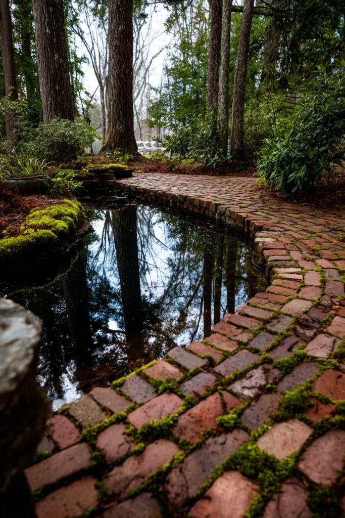 This winding brick path curves gently around a serene garden pond, with moss growing between the bricks and tall trees reflecting on the water’s surface. The combination of natural greenery and aged brick gives it a storybook charm that feels peaceful and timeless.