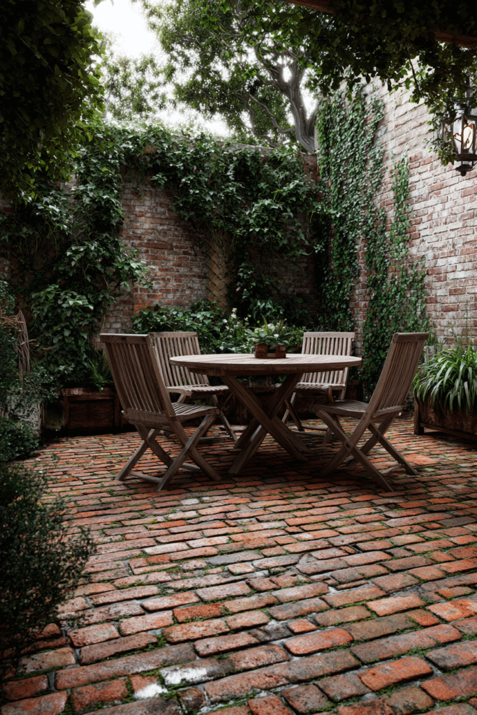 This charming courtyard captures an old-world feel with its weathered brick flooring and walls covered in lush climbing ivy. The round wooden table and chairs sit perfectly in the center, creating a cozy spot for dining or conversation surrounded by greenery.