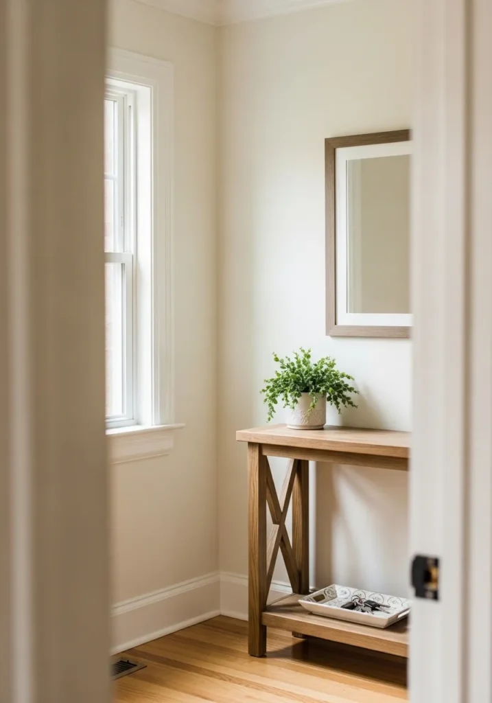 The wall color here reads very close to Benjamin Moore Swiss Coffee. It sits in that creamy off white range that feels warm but still light. Not a stark white. More of a soft neutral that works easily with wood furniture and natural finishes like the small console table in the space.