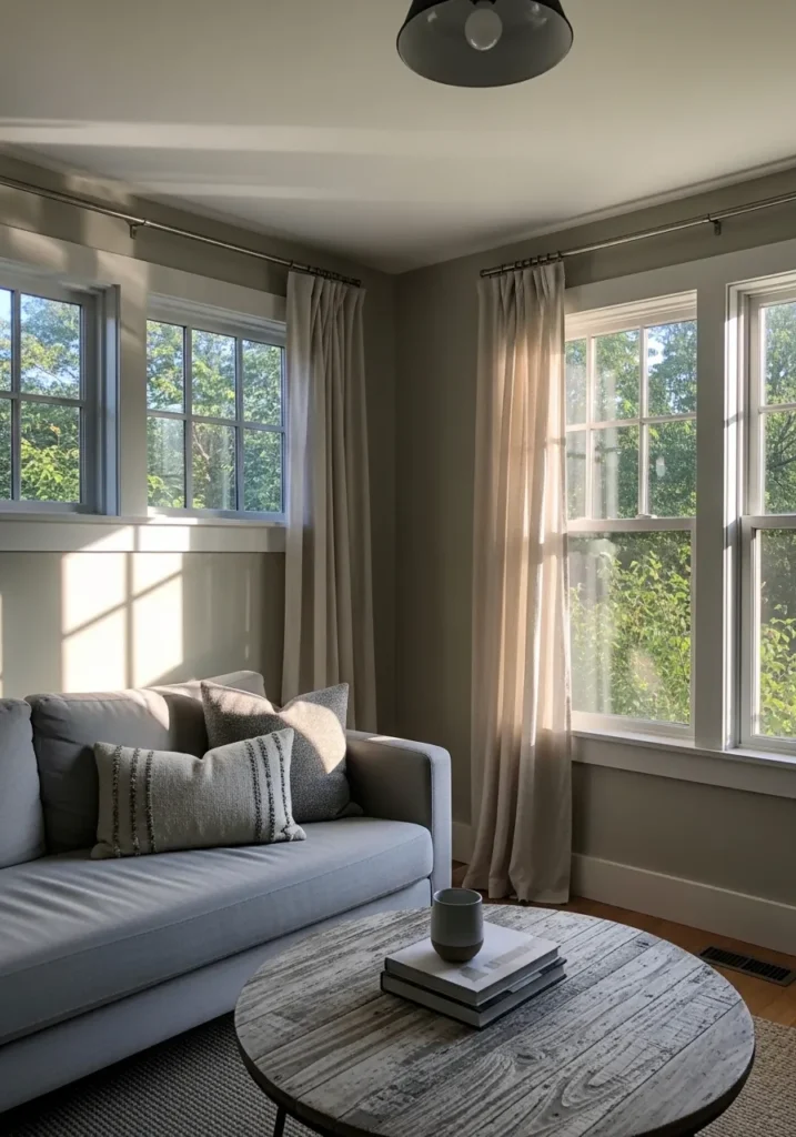 Revere Pewter tends to show a gentle warm undertone, especially next to white trim and neutral fabrics like the light sofa and curtains in the room. In brighter daylight it looks a bit lighter and more gray. In the evening it leans warmer. It works well in living rooms like this where there are several windows and a mix of soft textures.