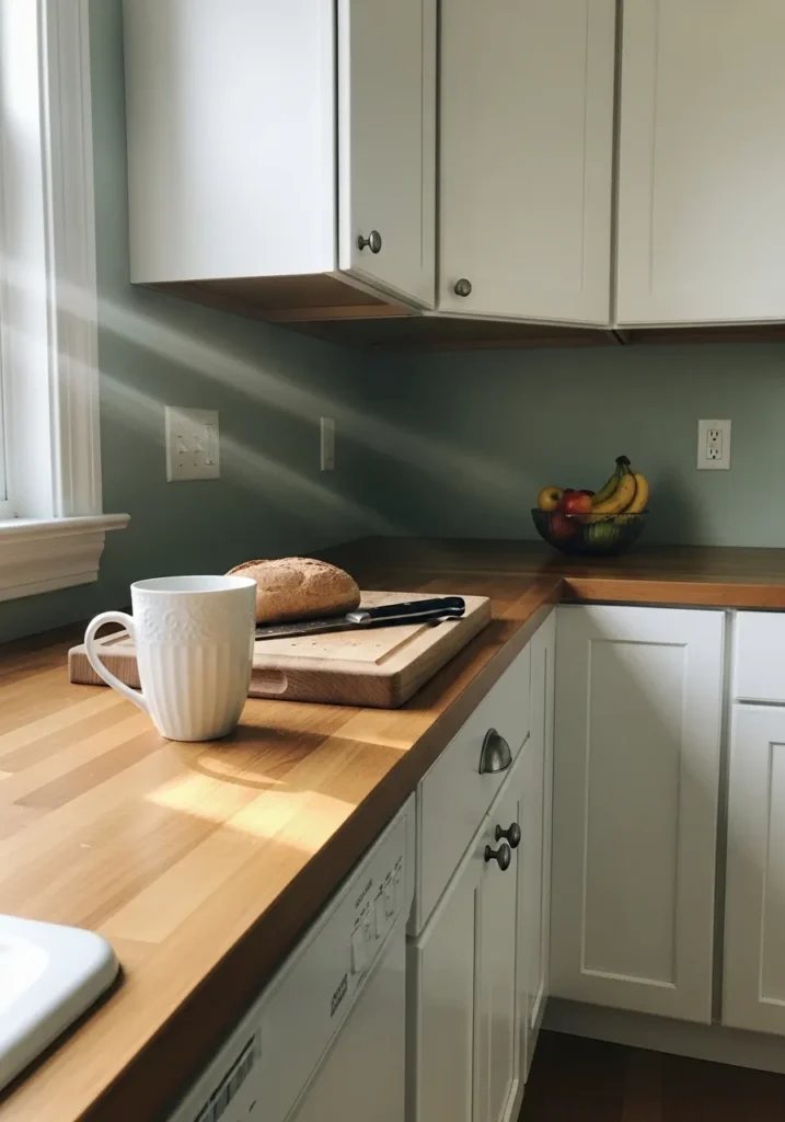 Saybrook Sage usually carries a quiet gray undertone that keeps the color from feeling too fresh or leafy. Next to white cabinets and a warm wood counter like this, the green reads gentle and balanced. It tends to look a little cooler near windows and a bit warmer in the evening, which is why it often works well on kitchen walls where light changes during the day.