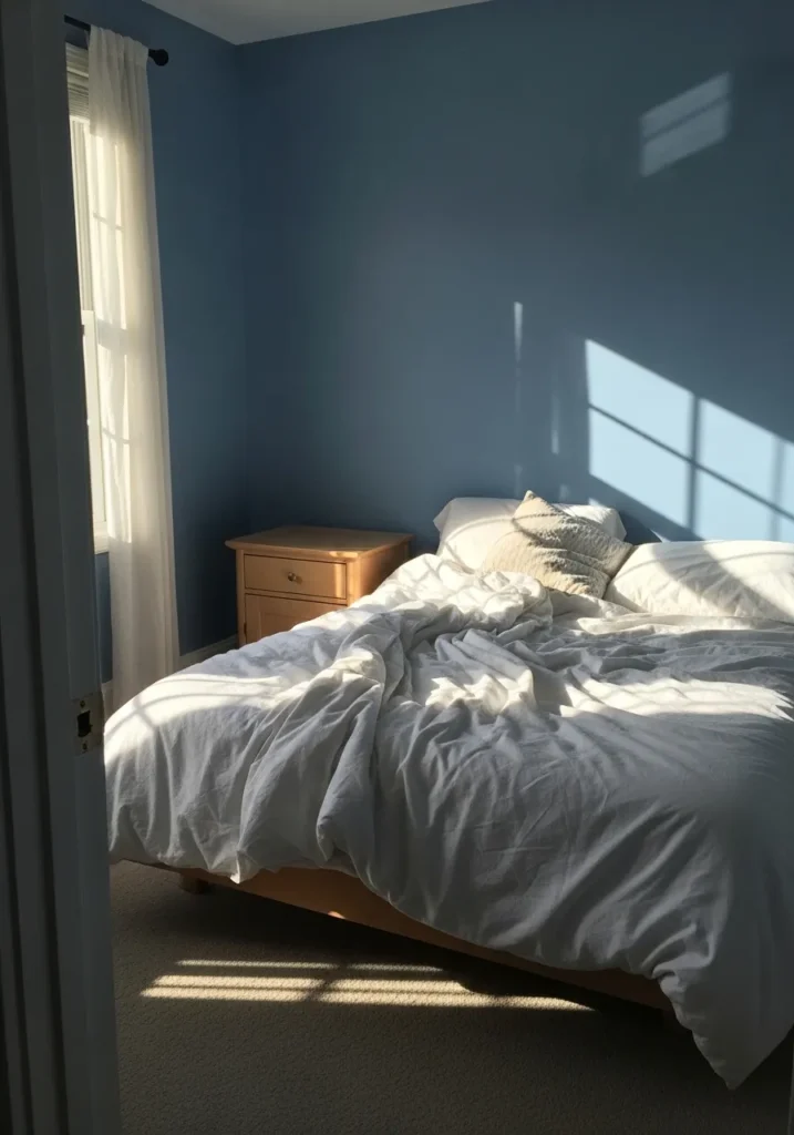 Smoke usually carries a gentle gray undertone that keeps the blue from feeling too sweet. With white bedding and simple wood furniture like the small nightstand, the color reads clean and calm. In strong daylight it shows more blue. In softer evening light it shifts a little grayer, which is why it often feels comfortable in bedrooms.