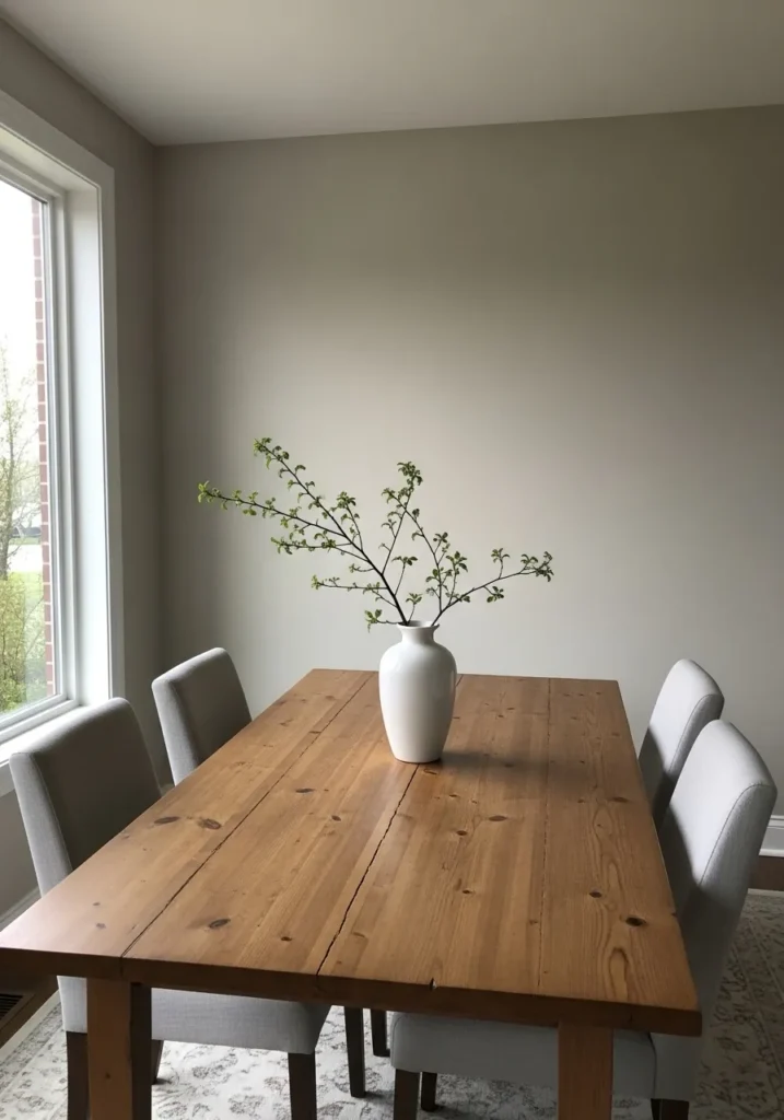 Edgecomb Gray tends to show a soft warm undertone, especially next to natural wood like the dining table. The color shifts a little through the day. In brighter daylight it leans slightly gray, while in softer light it looks warmer and more beige. That steady balance is why many people use it in dining spaces and open areas where furniture and finishes can vary.