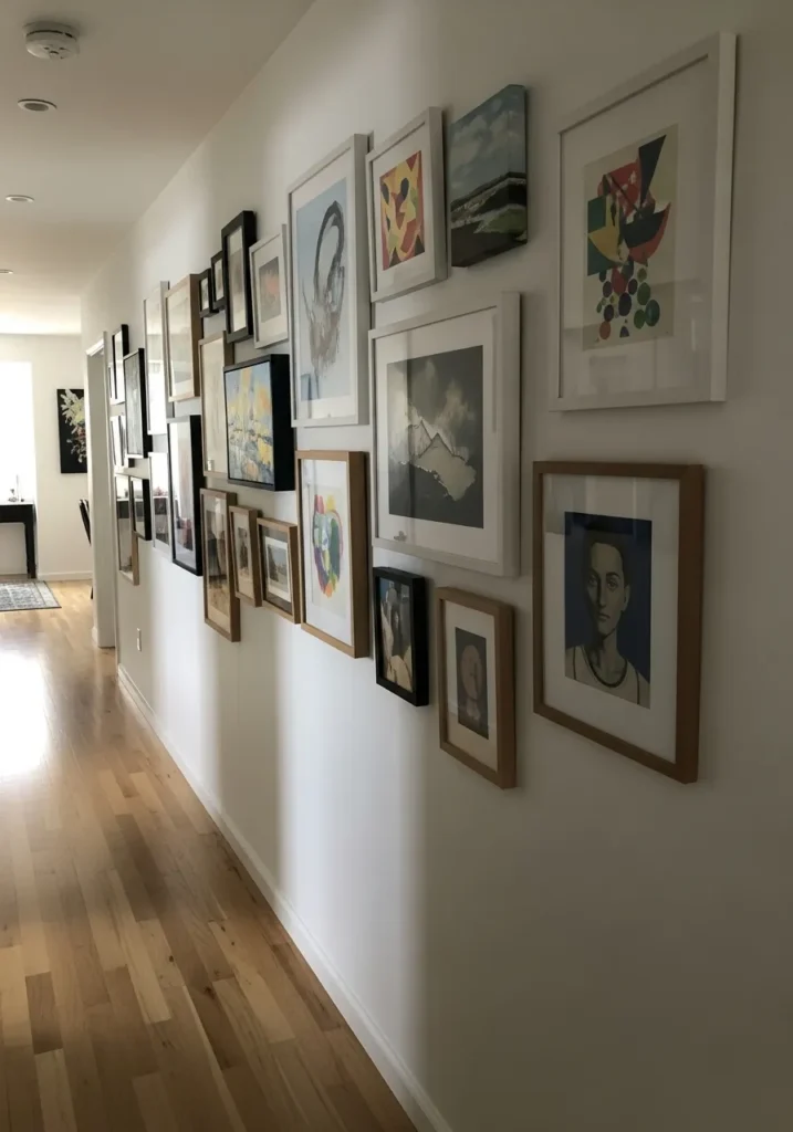 Classic Gray usually carries a gentle warm undertone. That subtle warmth helps it sit comfortably next to natural wood floors and a mix of picture frames like the gallery wall here. In bright daylight it can look nearly white. In lower light it shows a bit more beige, which is why many people like it for hallways and long walls where art or photos are the main focus.