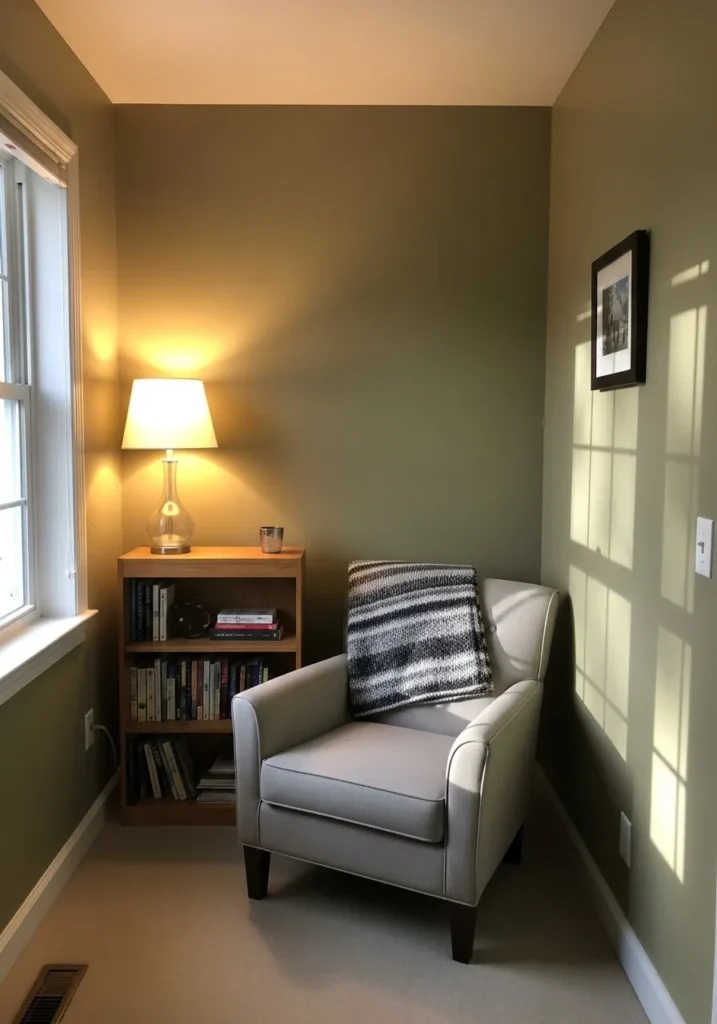 The wall color here reads close to Benjamin Moore Gloucester Sage. It sits in that muted olive green family that feels calm and a little earthy. Not a bright botanical green. More of a softened green that works well in quiet spaces.
