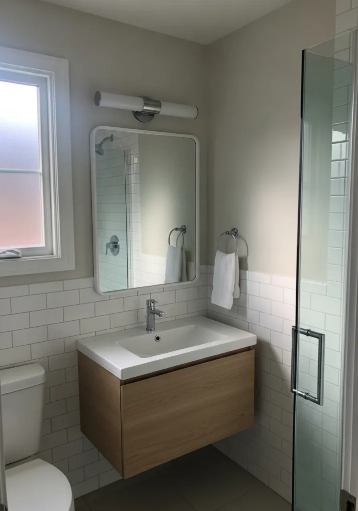 Pale Oak usually shows a gentle warm undertone that pairs nicely with white tile like the simple wall tile in this bathroom. Near a window it often reads a little lighter and slightly gray. In evening light it leans warmer and softer. Colors like this are often used in bathrooms because they stay neutral while still giving the walls a bit more presence than plain white.