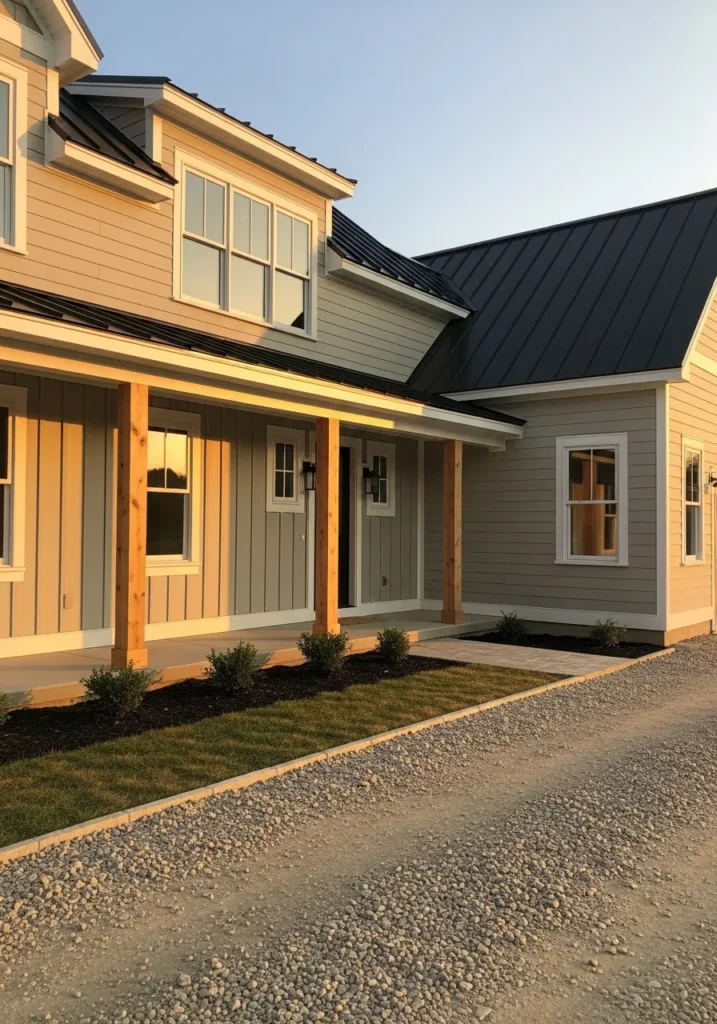 Revere Pewter tends to lean slightly warm with a subtle green gray undertone. That undertone is what helps it sit comfortably beside wood, stone, and darker roofs. In bright light it can look a bit lighter than expected, almost like a soft taupe gray. On shaded sides of the house it deepens a little and reads more like a classic greige. It is the kind of color that works well on farmhouse and craftsman style homes without looking trendy.