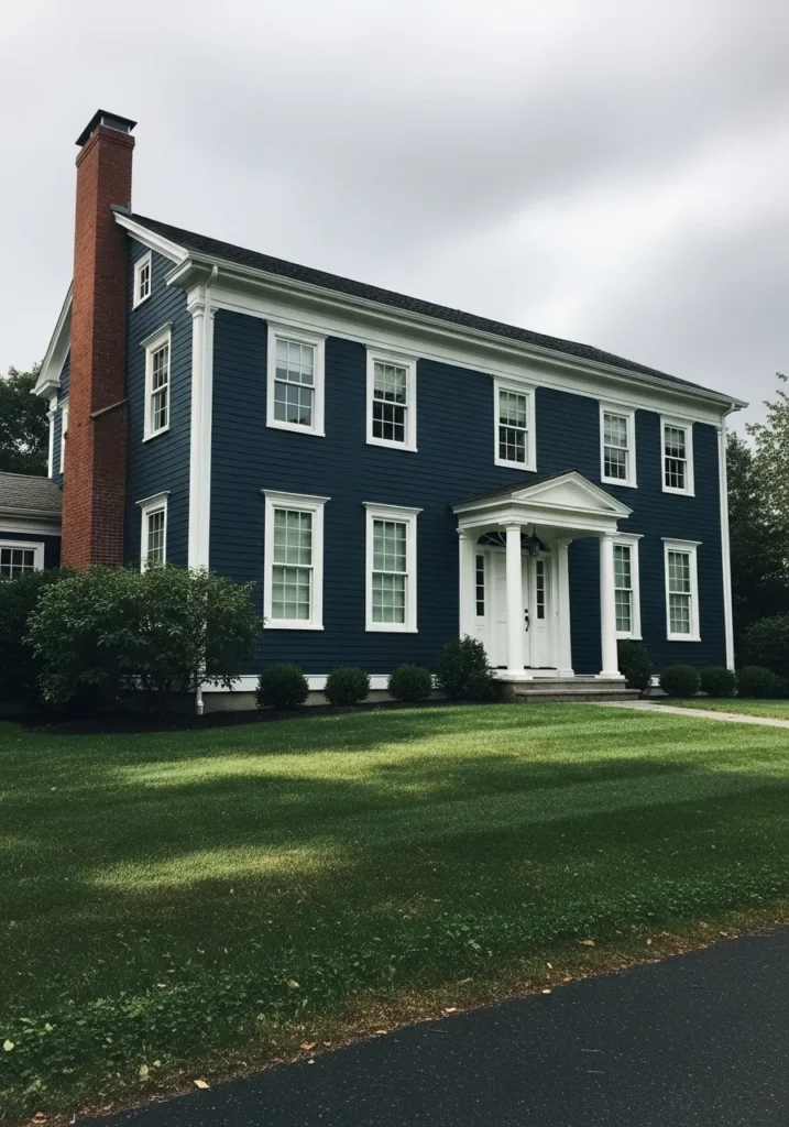 Hale Navy tends to carry a slight gray undertone, which keeps the blue from feeling too bright. That gray base is what makes it work so well on larger exterior surfaces. It also pairs easily with red brick, like the chimney here, and with crisp white trim. In brighter light it reads more blue. In shade it deepens and starts to look almost inky. A good choice when someone wants color on the house but still wants the overall look to stay classic.