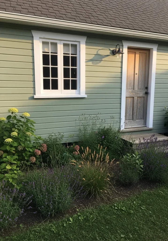 The siding here reads very close to Benjamin Moore Saybrook Sage. It is a soft sage green that leans slightly gray, which keeps it calm and easy to live with. Not a bright garden green. More of a muted herbal tone. Next to the white window trim and the simple wood door, the color feels natural and quiet.