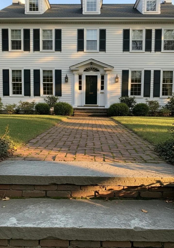 The siding on this house reads very close to Benjamin Moore White Dove. It is a creamy off white that sits comfortably between warm white and very light beige. You see this kind of color a lot on traditional homes because it feels clean without looking stark. Against the black shutters and darker roof details, the color holds its own nicely. It has just enough warmth to keep the exterior from feeling cold.
