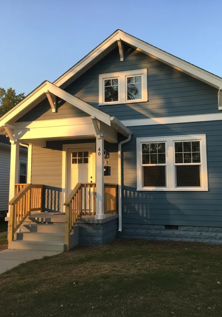 The siding here looks very close to Benjamin Moore Van Courtland Blue. It sits in that blue gray range that feels calm and slightly historic. Not a bright blue. More of a muted blue with a gray base that keeps it steady on a full exterior. Against the white trim around the windows, the color reads clearly but still relaxed.