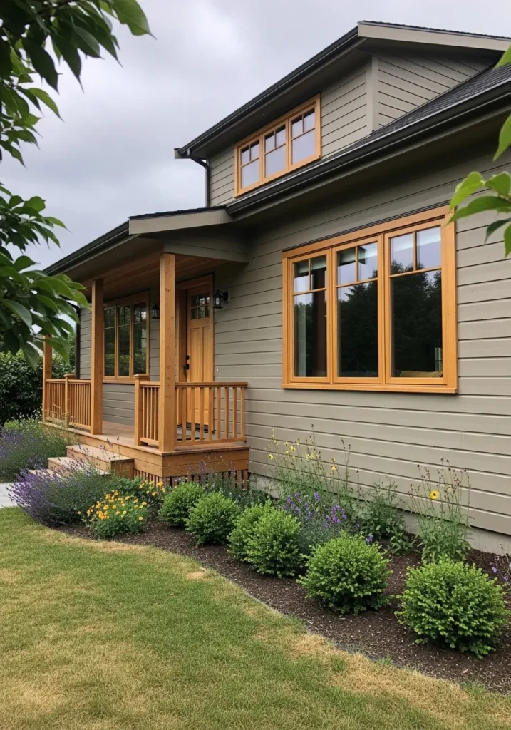 The siding on this home reads very close to Benjamin Moore Revere Pewter. It sits right in that warm greige range that people keep coming back to. Not quite beige, not quite gray. It has a quiet softness that works well on larger exterior surfaces, especially on homes with simple lines and natural wood nearby. Next to the wood porch posts here, the color shows its warm side.