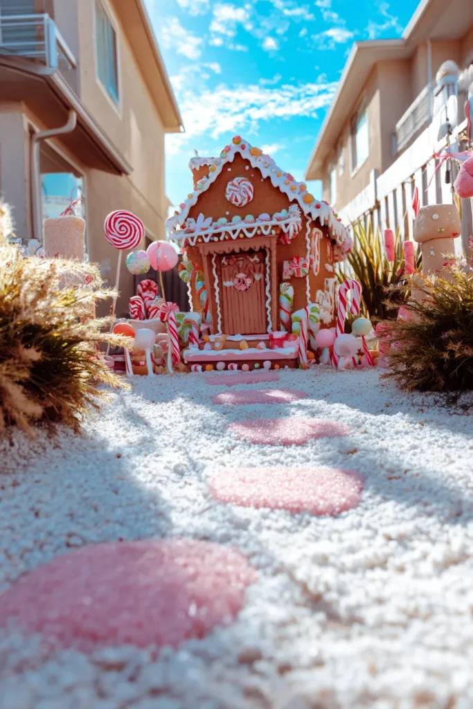 This whole setup gives me major life goals energy for outdoor holiday decorating, I have to admit. It’s so creative to use the yard space like this, turning the front lawn into a little edible fantasy world, even if it’s clearly decorative art. I just adore the texture of that sugar pathway leading up to the door, it’s so inviting and fun. It’s an incredibly impressive commitment to the Candyland theme, making me want to grab a giant lollipop and skip right down that sparkly path.