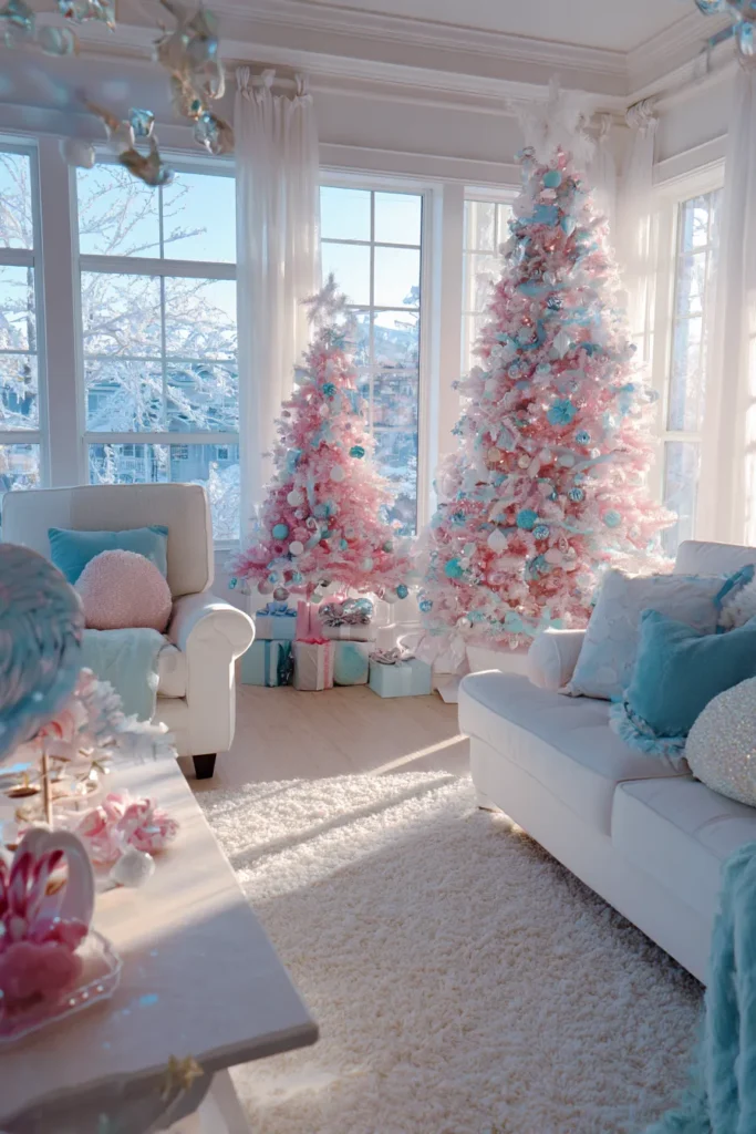 Imagine stepping into this room and instantly feeling like you’ve tumbled into a fluffy pastel dream world where it is perpetually a magical snowy day outside. Two gloriously pink Christmas trees, heavily adorned with dreamy light blue and white ornaments and ribbons, stand tall against a backdrop of large windows showcasing a sparkling, frost-covered landscape. The furniture is crisp white, offering a lovely contrast to the soft pink and aqua accents found in the throw pillows and blankets scattered on the cozy seating arrangements. A thick, white, shag rug covers the light wood floor, catching the bright sunlight streaming in, making the whole space feel incredibly light and airy, almost like cotton candy clouds.