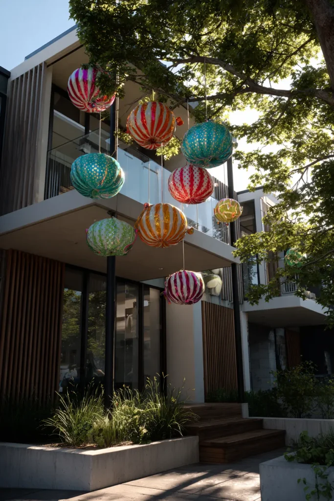 This modern home gets a totally unexpected and fun festive makeover with a vibrant outdoor installation that feels straight out of a giant candy shop. Giant, shiny, spherical decorations resembling oversized, striped, or polka-dotted gumballs or hard candies are suspended from the large tree branches over the entryway and balcony. The modern architecture, with its clean lines, glass railings, and warm wooden slats, provides a sophisticated, neutral canvas that makes the colorful orbs really stand out against the lush green foliage. Concrete planters with soft, grassy plantings soften the entryway steps leading up to the inviting glass doors.