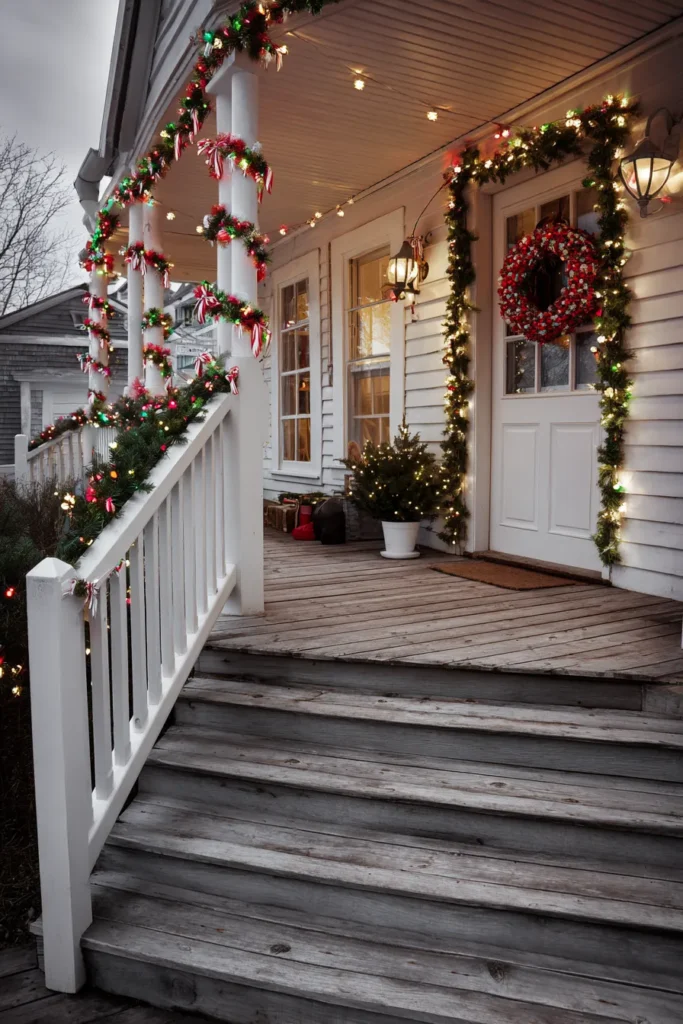 This charming, light-colored clapboard house porch is decorated with a classic nod to festive sweets and traditional greenery. Thick evergreen garlands, studded with colorful twinkling lights and generously accented with bright red and white candy cane bows, are draped beautifully along the porch railings and around the door frame. A bold red and white wreath hangs proudly on the white front door, while a small, illuminated potted tree sits near the entrance, all set against the weathered, rustic wood of the steps and porch floor. The warm glow from the outdoor lanterns and string lights creates such a cozy, inviting atmosphere as dusk settles in.