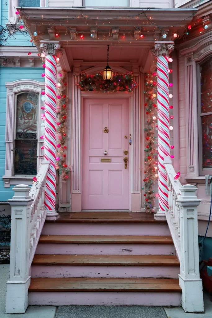 This gorgeous, historic home exterior leans fully into the Candyland theme with the most delightful entrance decorations. The stately porch columns are completely wrapped in a bold, alternating pink and white stripe, making them look exactly like massive peppermint sticks that have been standing guard all year long. The pale pink front door is framed by lush evergreen garlands woven with multi-colored fairy lights and ornaments that perfectly complement the main color palette. Even the aging wooden porch steps and railings add a sweet, slightly worn charm that keeps the whole look feeling wonderfully authentic and lived-in, not staged.