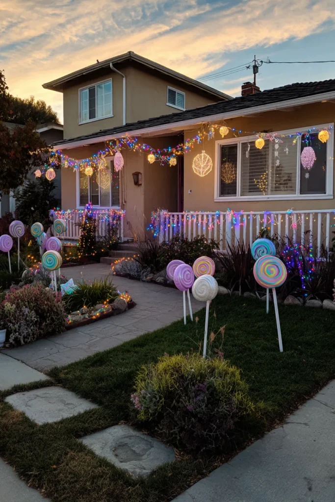 Oh my goodness, I am absolutely obsessed with the sheer joy radiating from this yard display. If you are looking for a fun and playful way to decorate that is totally unique, this is it, girl. I mean, giant lollipops right in your lawn talk about making a statement that screams happy holidays and sweet indulgence. It’s such a bright and cheerful way to decorate without going totally overboard with traditional wreaths or garlands, and I think it’s incredibly impressive how it turns a normal little front yard into a destination.