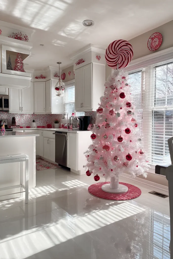 Honestly, this kitchen design is my absolute favorite kind of holiday makeover because it’s so sophisticated yet utterly playful. I love how they stuck to such a tight color palette of white, pink, and red; it keeps the space feeling chic even with all the candy goodness everywhere. It makes me think of baking holiday cookies and sipping something bubbly right on that shiny floor while admiring the Christmas tree. It’s proof that you can go super thematic without sacrificing style, and I think it looks incredibly impressive.