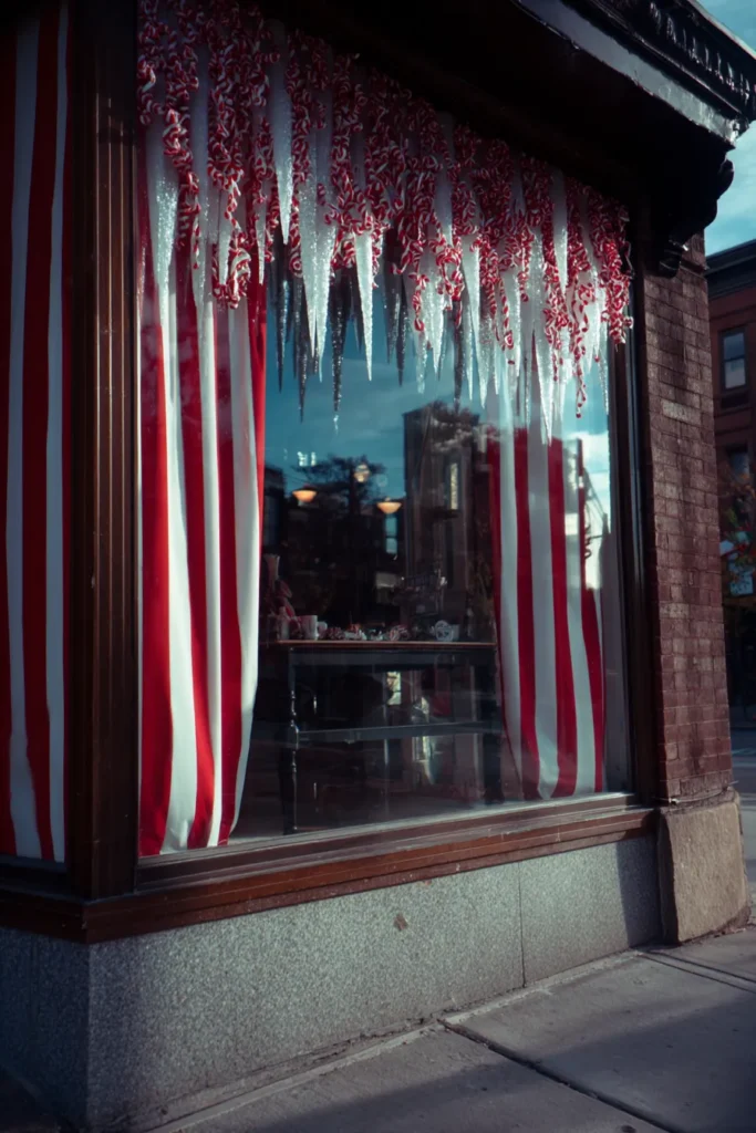 I am completely captivated by this window design it screams old-school festive charm. It’s so dramatic and instantly recognizable as a nod to those sweet treats we all loved as kids. I really appreciate how the red and white stripes are used so heavily; it’s a powerful, clean pattern that is undeniably Christmas but with a strong Candyland twist. It just makes me want to walk right up and try to peek in for a closer look at whatever sweet treasures might be inside that perfectly dressed window.
